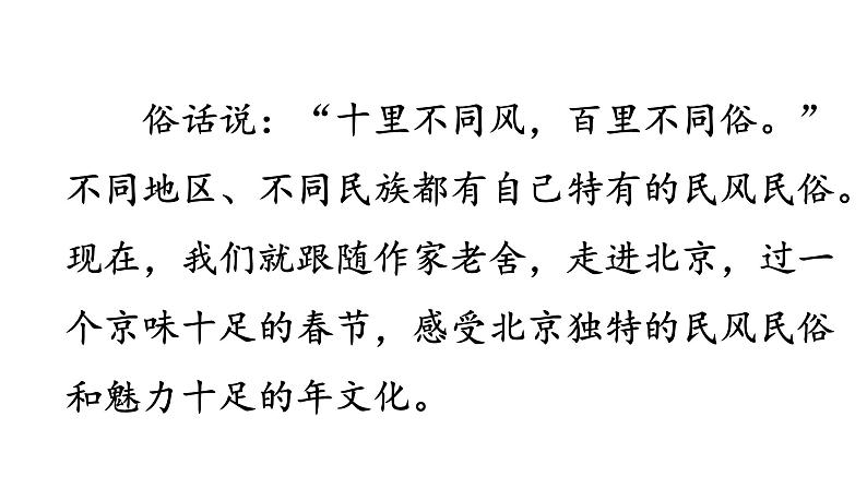俗话说:“十里不同风,百里不同俗。”不同地区、不同民族都有自己特有的民风民俗。现在,我们就跟随作家老舍,走进北京,过一个京味十足的春节,感受北京独特的民风民俗和魅力十足的年文化。