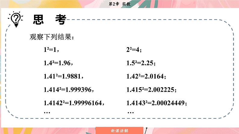 观察下列结果: 1²=1, 2²=4; 1.4²=1.96, 1.5²=2.25; 1.41²=1.9881, 1.42²=2.0164; 1.414²=1.999396, 1.415²=2.002225; 1.4142²=1.99996164, 1.4143²=2.00024449; … …