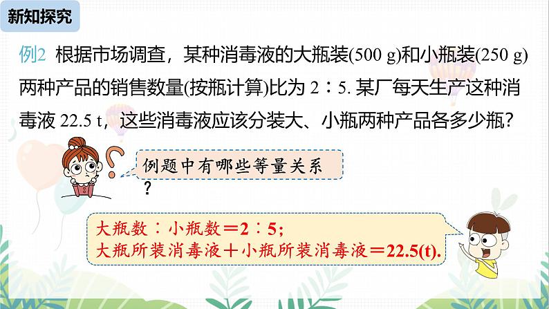 例2 根据市场调查,某种消毒液的大瓶装(500 g)和小瓶装(250 g)两种产品的销售数量(按瓶计算)比为 2︰5. 某厂每天生产这种消毒液 22.5 t,这些消毒液应该分装大、小瓶两种产品各多少瓶?