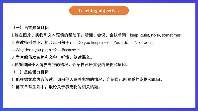 (一)语言知识目标1.能在图片、实物和文本语境的帮助下,听懂、会说、会认单词:keep, quiet, nisy, smetimes2. 在教师引导下,初步运用句子:—D yu keep a …? —Yes, I d. —N, I dn’t.—Why dn’t yu get a …? —Because …3. 学生能借助图片和文字,听懂、朗读课文。4.能够询问他人饲养宠物的情况,介绍自己所喜爱的宠物和原因。(二)思维能力目标1. 能根据文本内容阅读,询问他人饲养宠物的情况,介绍自己所喜爱的宠物和原因。2. 能在日常生活中,谈论关于养宠物的相关话题。