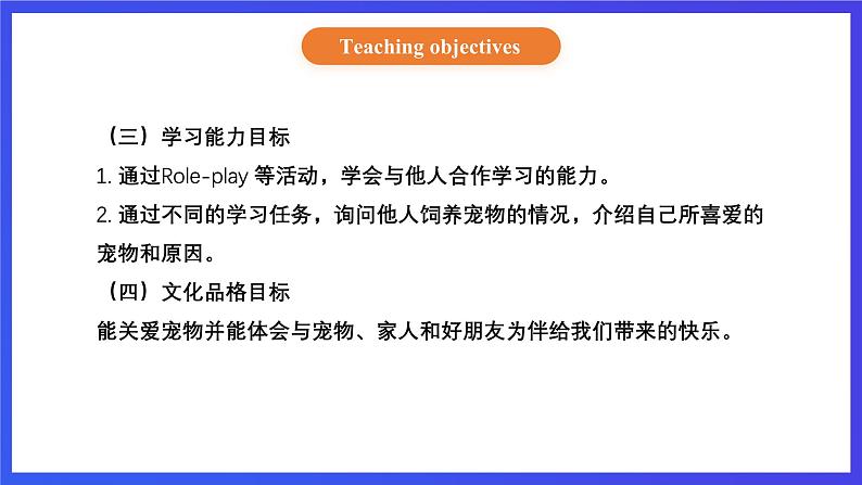 (三)学习能力目标1. 通过Rle-play 等活动,学会与他人合作学习的能力。2. 通过不同的学习任务,询问他人饲养宠物的情况,介绍自己所喜爱的宠物和原因。(四)文化品格目标能关爱宠物并能体会与宠物、家人和好朋友为伴给我们带来的快乐。