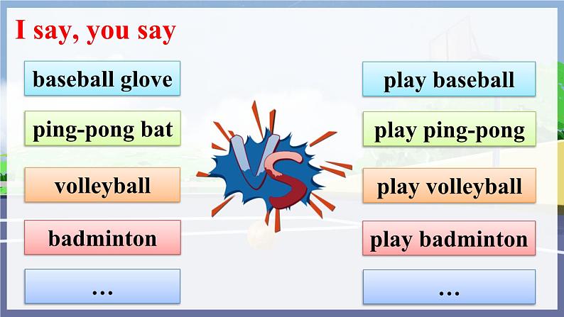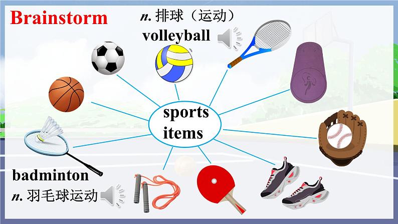 ping-png bat, badmintn racket, baseball glve, jump rpe, vlleyball, mat, running shes ...