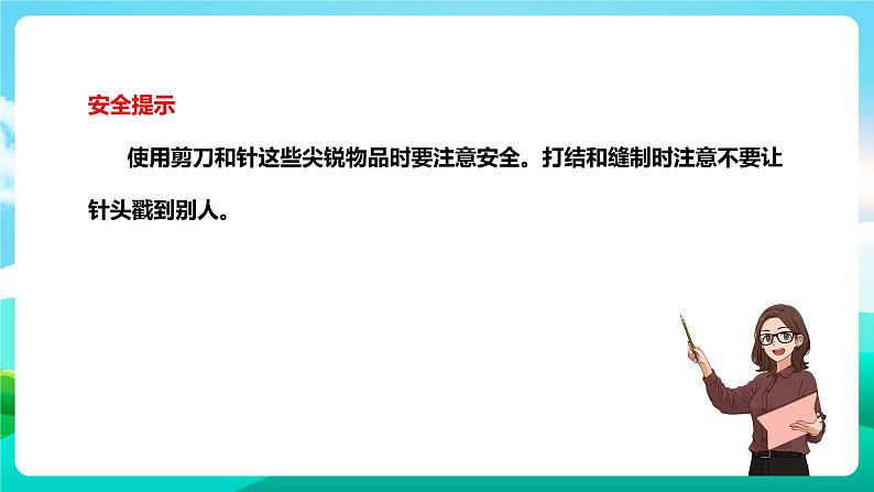 安全提示 使用剪刀和针这些尖锐物品时要注意安全。打结和缝制时注意不要让针头戳到别人。