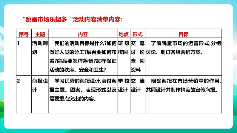 同学们,活动前我们最好先分头了解跳蚤市场,制订小组活动计划,想想需要提前做哪些事情再一一记录下来。