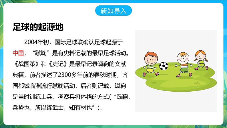 2004年初,国际足球联确认足球起源于中国,“蹴鞠”是有史料记载的最早足球活动。《战国策》和《史记》是最早记录蹴鞠的文献典籍,前者描述了2300多年前的春秋时期,齐国都城临淄流行蹴鞠活动,后者则记载,蹴鞠是当时训练士兵、考察兵将体格的方式(“蹹鞠,兵势也,所以练武士,知有材也”)。