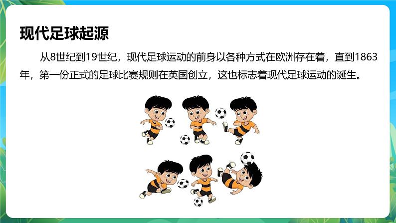 从8世纪到19世纪,现代足球运动的前身以各种方式在欧洲存在着,直到1863年,第一份正式的足球比赛规则在英国创立,这也标志着现代足球运动的诞生。
