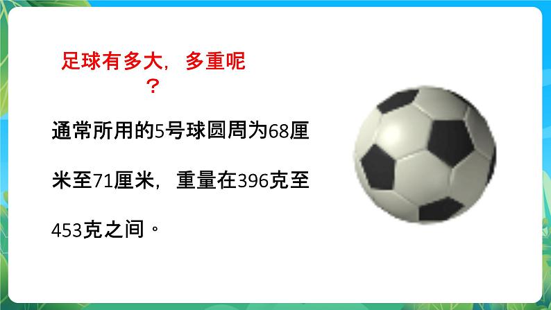 通常所用的5号球圆周为68厘米至71厘米,重量在396克至453克之间。