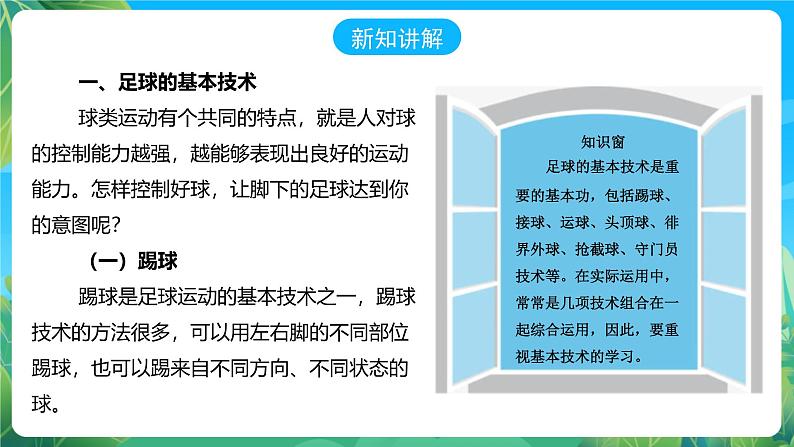 知识窗 足球的基本技术是重要的基本功,包括踢球、接球、运球、头顶球、徘界外球、抢截球、守门员技术等。在实际运用中,常常是几项技术组合在一起综合运用,因此,要重视基本技术的学习。