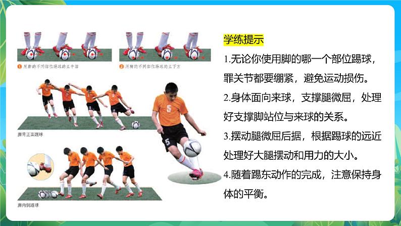 学练提示1.无论你使用脚的哪一个部位踢球,罪关节都要绷紧,避免运动损伤。2.身体面向来球,支撑腿微屈,处理好支撑脚站位与来球的关系。3.摆动腿微屈后据,根据踢球的远近处理好大腿摆动和用力的大小。4.随着踢东动作的完成,注意保持身体的平衡。
