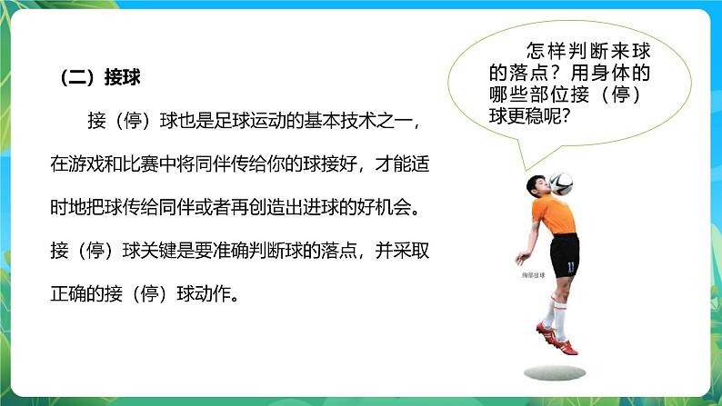 (二)接球 接(停)球也是足球运动的基本技术之一,在游戏和比赛中将同伴传给你的球接好,才能适时地把球传给同伴或者再创造出进球的好机会。接(停)球关键是要准确判断球的落点,并采取正确的接(停)球动作。