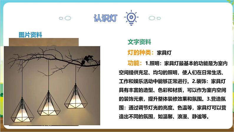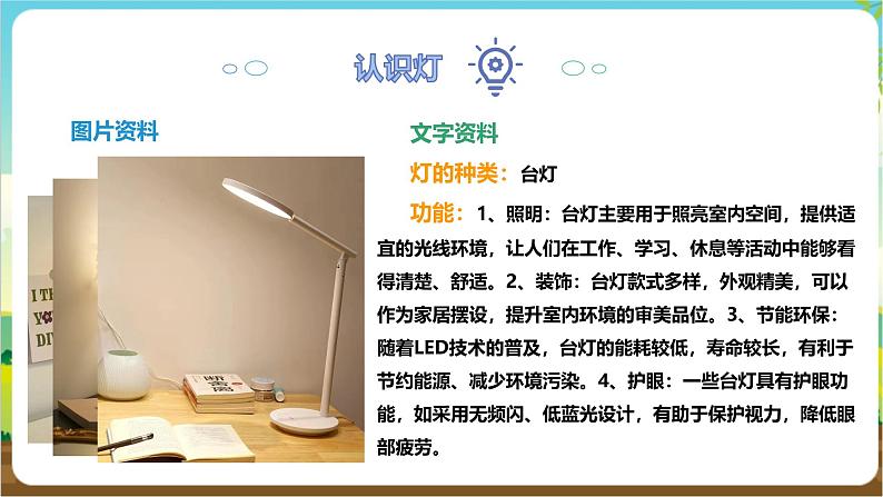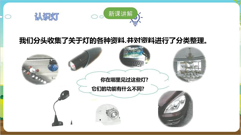 展开3.1《和灯做朋友》沪科·黔科版综合实践六年级下册价值体认:了解日常生活必备品的重要性。责任担当:承担自我安全与社会安全的责任,培养自主管理和服务于集体的意识。问题解决:在学习不同种类的灯具过程中,能够独立思考、提出问题,并能找到有效解决问题的办法。创意物化:在生活实际中展现创造力,比如提出问题,思考方案,用创新思维解决问题,激发个体能动性的同时提升创新精神。学习目标我们的生活中究竟有多少种灯?这些灯有什么不同?被这些问题难住了吧?别着急,现在就和同伴一起行动起来,去认识各种各样的灯,然后以小组为单位在班级交流会上进行交流。别忘了总结你的收获哦。新知导入我们分头收集了关于灯的各种资料,并对资料进行了分类整理。你在哪里见过这些灯?它们的功能有什么不同?新课讲解图片资料文字资料灯的种类:台灯功能:1、照明:台灯主要用于照亮室内空间,提供适宜的光线环境,让人们在工作、学习、休息等活动中能够看得清楚、舒适。2、装饰:台灯款式多样,外观精美,可以作为家居摆设,提升室内环境的审美品位。3、节能环保:随着LED技术的普及,台灯的能耗较低,寿命较长,有利于节约能源、减少环境污染。4、护眼:一些台灯具有护眼功能,如采用无频闪、低蓝光设计,有助于保护视力,降低眼部疲劳。图片资料文字资料灯的种类:家具灯功能:1.照明:家具灯最基本的功能是为室内空间提供充足、均匀的照明,使人们在日常生活、工作和娱乐活动中能够正常进行。2.装饰:家具灯具有丰富的造型、色彩和材质,可以作为室内空间的装饰元素,提升整体装修效果和氛围。3.营造氛围:通过调节灯光的亮度、色温等,家具灯可以营造出不同的氛围,如温馨、浪漫、静谧等。图片资料文字资料灯的种类:手电筒功能:1.照明:手电筒主要用于照亮周围环境,为夜间行走、露营等活动提供光源,使人们能在黑暗环境下进行正常活动。手电筒通常是便携式的,可以在停电、自然灾害等紧急情况下提供照明,帮助人们应对突发状况。2.安全警示:手电筒通常具有闪烁模式,可以在黑暗环境中起到警示作用,提高行人和车辆的安全性。3.便捷生活:手电筒小巧轻便,易于携带,方便人们在日常生活中使用。图片资料文字资料灯的种类:电脑LED灯功能:1、信息展示:LED显示屏可以实时显示电脑运行过程中的各种信息。2.图形输出:LED显示屏可以将电脑处理的图形、图像等数据以高清晰度的形式展示出来,提供良好的视觉体验。3.视频播放:LED显示屏支持各种视频播放软件,可用于观看电影、短视频、游戏等。4.节能环保:LED显示屏具有较低的功耗,较长的使用寿命,有利于节约能源,减少环境污染。5.广泛应用:LED显示屏广泛应用于各种场合,如家庭、办公室、商场等,满足多样化的使用需求。图片资料文字资料灯的种类:汽车灯功能:1、照明:汽车灯用于照亮车辆前方的道路,帮助驾驶员在夜间或恶劣天气条件下看清楚道路状况,提高行车安全。2、信号提醒:汽车灯可用于向其他道路使用者发送信号,如转向灯、刹车灯等。这有助于提醒其他驾驶员注意车辆的行驶意图,避免发生交通事故。3、时尚美观:现代汽车灯的设计越来越注重美观和个性化,成为汽车外观的重要组成部分,提升车辆的整体品质感。图片资料文字资料灯的种类:矿用安全帽灯功能:1、照明:矿用安全帽灯为矿工提供光源,确保在黑暗的矿井中能够看清楚周围环境,提高工作安全性。2、安全警示功能:矿用安全帽灯通常具有闪烁模式,可以在紧急情况下提醒其他矿工或救援人员注意位置,提高安全性。3、防水防摔设计:矿用安全帽灯采用防水、防摔设计,能在恶劣环境下正常使用,适应矿山作业的高强度需求。4、紧急求救功能:部分矿用安全帽灯具备SOS求救信号功能,当矿工遇到危险时,可以通过闪烁特殊的求救信号向外界求救。经过讨论,我们确定了本组的交流方案,并做了充分的准备。班级交流会交流方案xx小组交流内容介绍无影灯的外形、作用交流形式图片投影、口头介绍交流时的组员分工张宇进行图片展示、王红介绍无影灯的外形与作用、陈东介绍无影灯的工作原理需要补充收集的材料:无影灯的工作原理在班级交流会上,各小组介绍的内容非常丰富,组员配合默契,表现十分出色!请看,这是医生在无影灯下为病人做手术。无影灯的多只灯泡从不同角度照射手术台,而且灯光经过了滤色器的处理,所以不会产生阴影……无影灯由几只排列成环形的灯泡组成,光线柔和,是手术室的专用灯。请问,无影灯为什么不会产生阴影?无影灯下为什么看不到物体的影子?正常情况下,当光线照射在不透明的东西上时,就会产生影子,中间影子最深的地方叫作本影,四周渐渐变浅。无影灯的工作原理是,圆形灯盘内装有向各个方向照射的灯光,增大了发光源的面积,使得本影变淡,达到无影效果。这样就能从不同角度把光线照射到手术台上,既保证手术视野有足够的亮度,同时又不产生明显的本影,所以取名无影灯。在交流中获得更多的信息从其他小组的介绍中了解了哪些信息?对其他小组的介绍产生了哪些疑问?通过现场同学们提出的疑问和进一步的交流,获得了哪些新的信息?在交流会上,我从其他小组的介绍中获得了不少关于灯的知识:针对各组介绍的内容,我提出的问题:1、灯的起源与发展历程是怎样的?2、灯