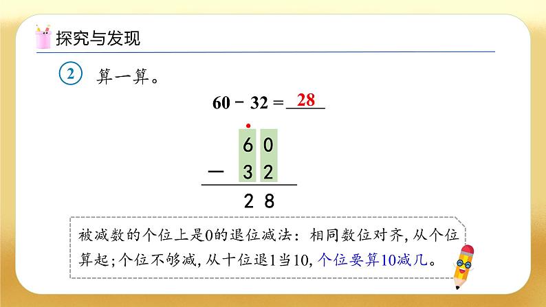 个位上0减4不够减,从十位退1后,个位要算( )减( )。
