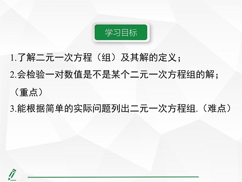 1.了解二元一次方程(组)及其解的定义;2.会检验一对数值是不是某个二元一次方程组的解;(重点)3.能根据简单的实际问题列出二元一次方程组.(难点)