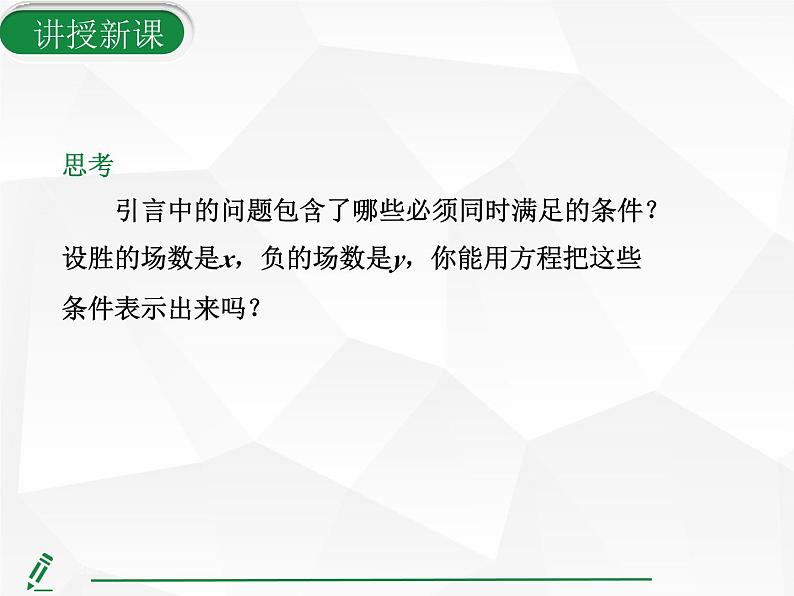 思考 引言中的问题包含了哪些必须同时满足的条件?设胜的场数是x,负的场数是y,你能用方程把这些条件表示出来吗?