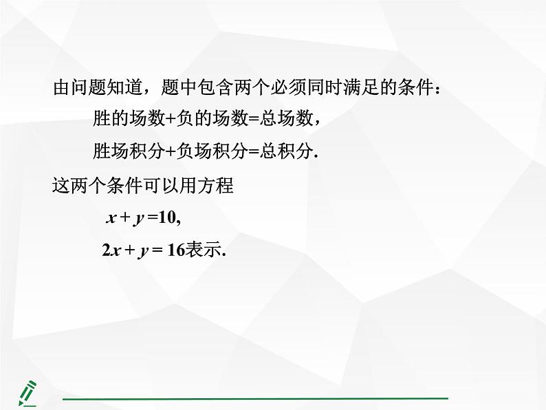 由问题知道,题中包含两个必须同时满足的条件: 胜的场数+负的场数=总场数, 胜场积分+负场积分=总积分.这两个条件可以用方程 x + y =10, 2x + y = 16表示.