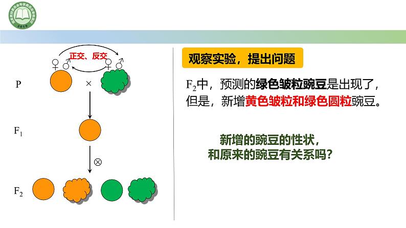 F2中,预测的绿色皱粒豌豆是出现了,但是,新增黄色皱粒和绿色圆粒豌豆。