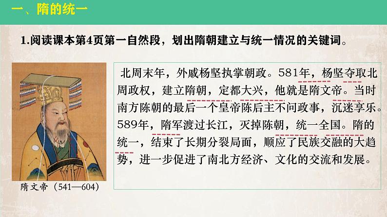 1.阅读课本第4页第一自然段,划出隋朝建立与统一情况的关键词。