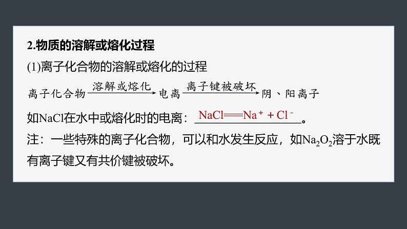 如NaCl在水中或熔化时的电离: 。注:一些特殊的离子化合物,可以和水发生反应,如Na2O2溶于水既有离子键又有共价键被破坏。