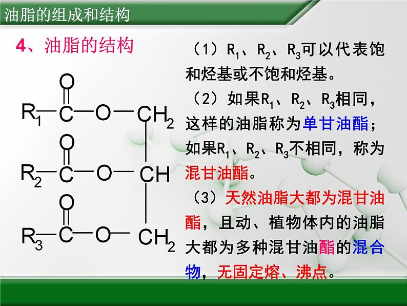 (1)R1、R2、R3可以代表饱和烃基或不饱和烃基。(2)如果R1、R2、R3相同,这样的油脂称为单甘油酯;如果R1、R2、R3不相同,称为混甘油酯。(3)天然油脂大都为混甘油酯,且动、植物体内的油脂大都为多种混甘油酯的混合物,无固定熔、沸点。