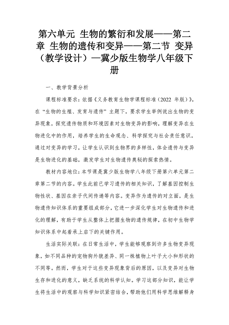 第六单元 生物的繁衍和发展——第二章 生物的遗传和变异——第二节 变异(教学设计)—冀少版生物学八年级下册