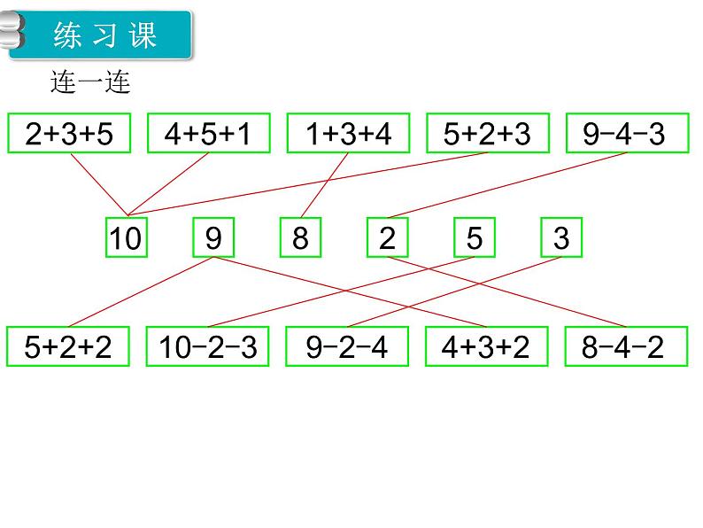 这是一份人教版一年级上册加减混合优质课件ppt,PPT课件主要包含了练习课,连一连,+3+5,+5+1,+3+4,5+2+3,9-4-3,+2+2,-2-3,-2-4等内容,欢迎下载使用。