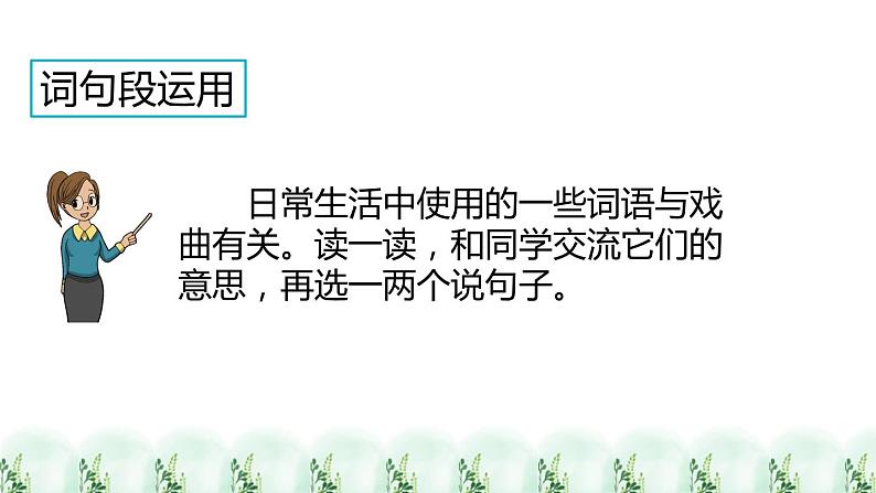 日常生活中使用的一些词语与戏曲有关。读一读,和同学交流它们的意思,再选一两个说句子。