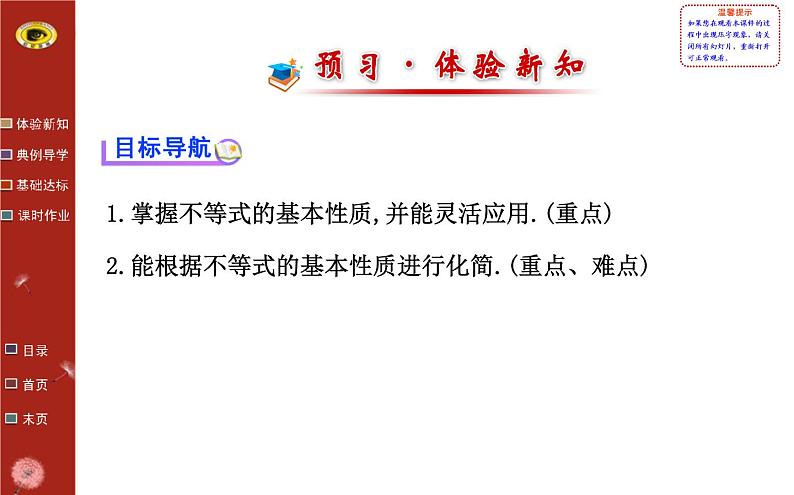 展开1.掌握不等式的基本性质,并能灵活应用.(重点)2.能根据不等式的基本性质进行化简.(重点、难点)