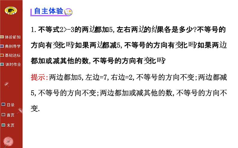 1.不等式2>-3的两边都加5,左右两边的结果各是多少?不等号的方向有变化吗?如果两边都减5,不等号的方向有变化吗?如果两边都加或减其他的数,不等号的方向有变化吗?提示:两边都加5,左边=7,右边=2,不等号的方向不变;两边都减5,不等号的方向不变;两边都加或减其他的数,不等号的方向不变.