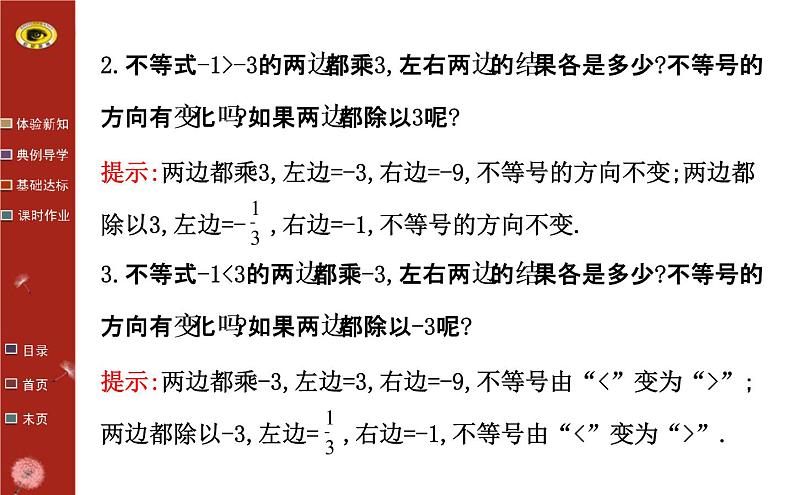 2.不等式-1>-3的两边都乘3,左右两边的结果各是多少?不等号的方向有变化吗?如果两边都除以3呢?提示:两边都乘3,左边=-3,右边=-9,不等号的方向不变;两边都除以3,左边=- ,右边=-1,不等号的方向不变.3.不等式-1<3的两边都乘-3,左右两边的结果各是多少?不等号的方向有变化吗?如果两边都除以-3呢?提示:两边都乘-3,左边=3,右边=-9,不等号由“<”变为“>”;两边都除以-3,左边= ,右边=-1,不等号由“<”变为“>”.