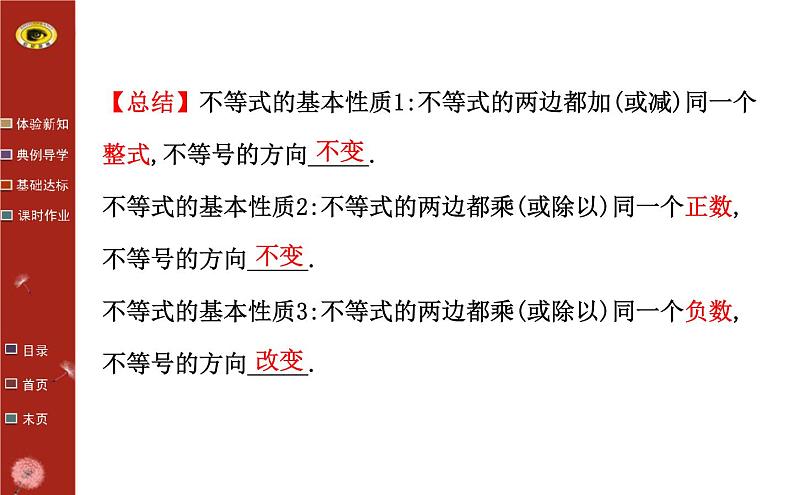 【总结】不等式的基本性质1:不等式的两边都加(或减)同一个整式,不等号的方向_____.不等式的基本性质2:不等式的两边都乘(或除以)同一个正数,不等号的方向_____.不等式的基本性质3:不等式的两边都乘(或除以)同一个负数,不等号的方向_____.