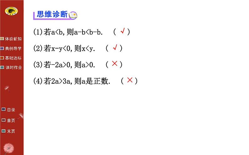 (1)若a0,则a>0. ( )(4)若2a>3a,则a是正数. ( )