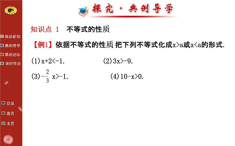 知识点 1 不等式的性质 【例1】依据不等式的性质,把下列不等式化成x>a或x-9.(3)- x>-1. (4)10-x>0.