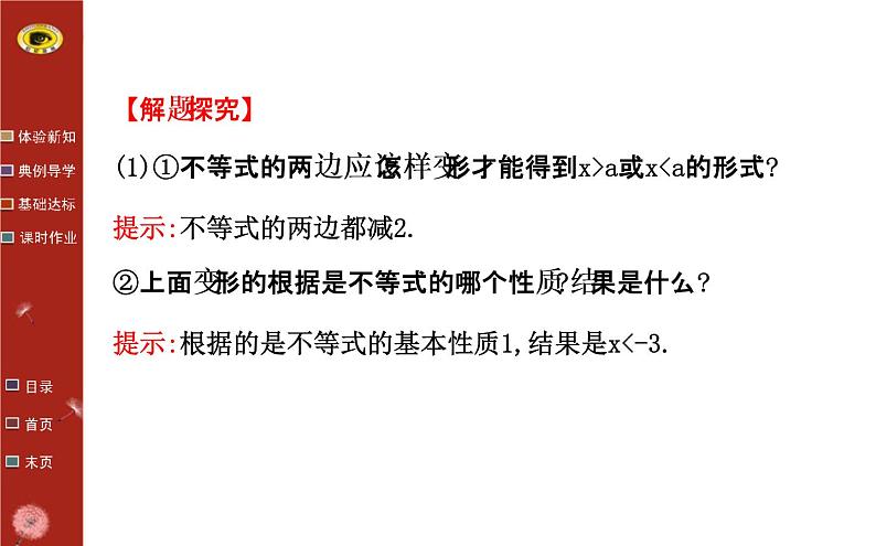 【解题探究】(1)①不等式的两边应该怎样变形才能得到x>a或x(2)①不等式的两边应该怎样变形才能得到x>a或x-3.