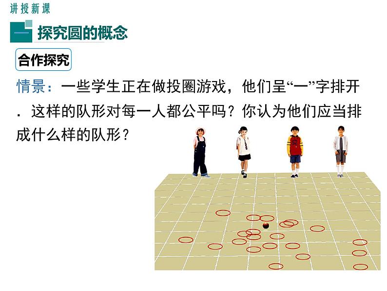 情景:一些学生正在做投圈游戏,他们呈“一”字排开.这样的队形对每一人都公平吗?你认为他们应当排成什么样的队形?