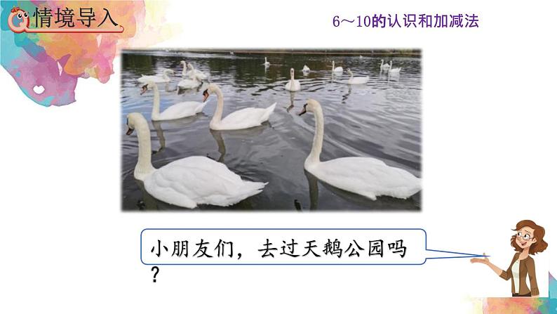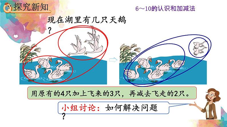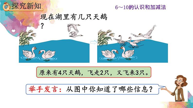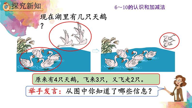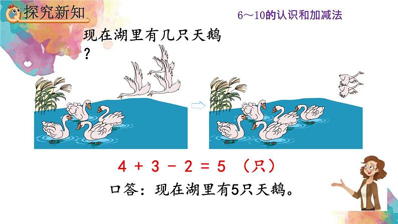 口答:现在湖里有5只天鹅。