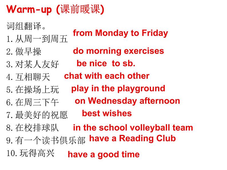 词组翻译。1.从周一到周五 2.做早操 3.对某人友好 4.互相聊天 5.在操场上玩 6.在周三下午 7.最美好的祝愿 8.在校排球队9.有一个读书俱乐部 10.玩得高兴