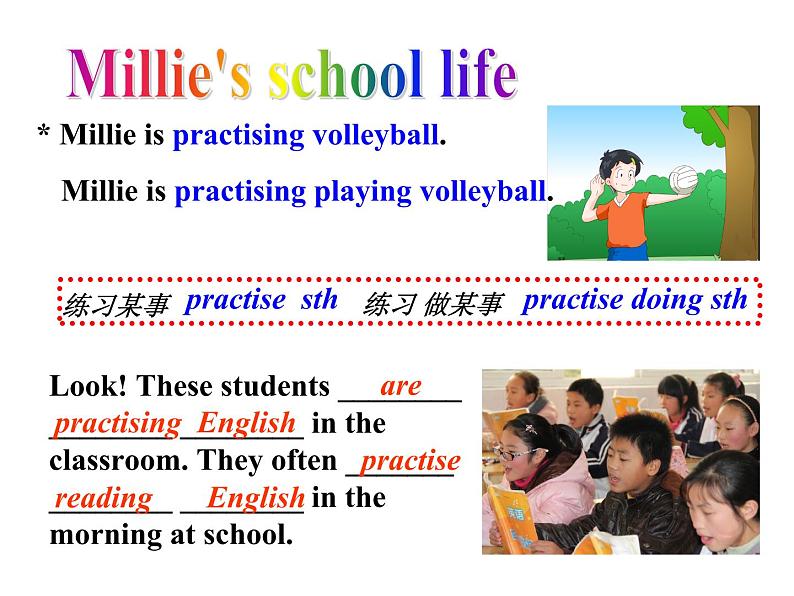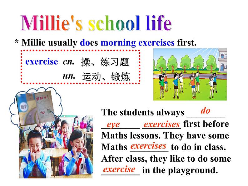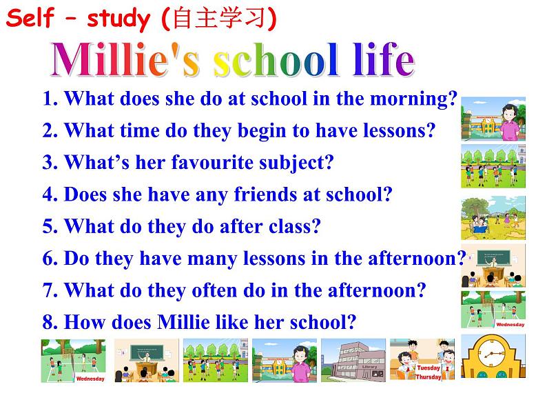 1. What des she d at schl in the mrning?2. What time d they begin t have lessns?3. What’s her favurite subject?4. Des she have any friends at schl?5. What d they d after class?6. D they have many lessns in the afternn?7. What d they ften d in the afternn? 8. Hw des Millie like her schl?