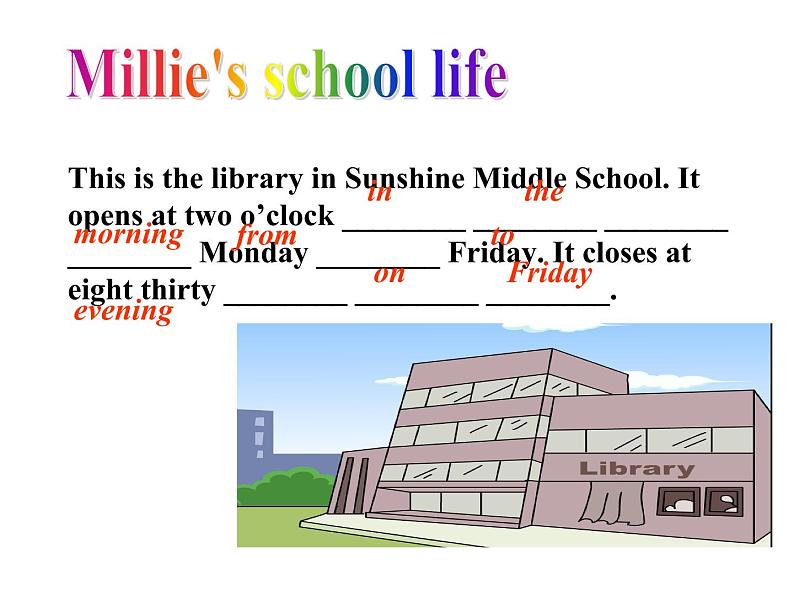 This is the library in Sunshine Middle Schl. It pens at tw ’clck ________ ________ ________ ________ Mnday ________ Friday. It clses at eight thirty ________ ________ ________.