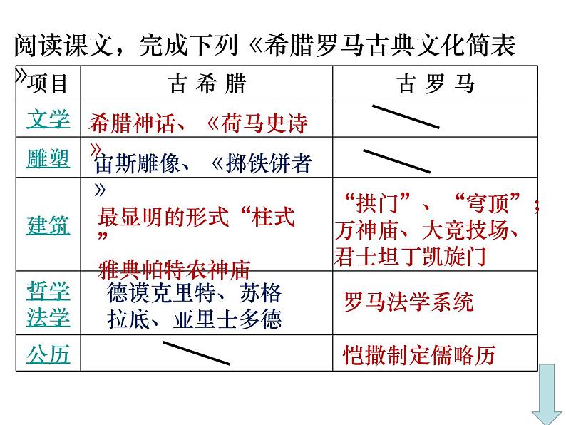 阅读课文,完成下列《希腊罗马古典文化简表》