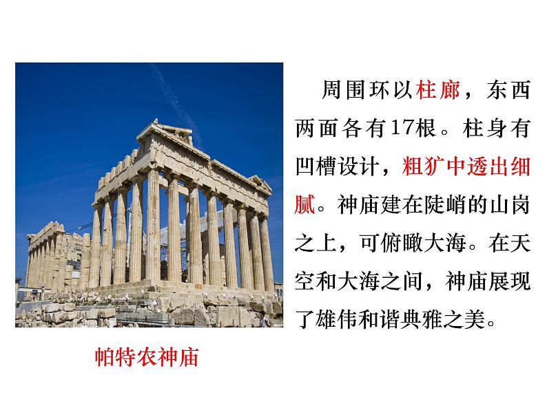 周围环以柱廊,东西两面各有17根。柱身有凹槽设计,粗犷中透出细腻。神庙建在陡峭的山岗之上,可俯瞰大海。在天空和大海之间,神庙展现了雄伟和谐典雅之美。