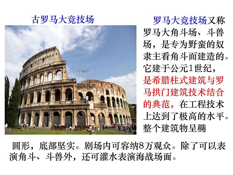 罗马大竞技场又称罗马大角斗场、斗兽场,是专为野蛮的奴隶主看角斗而建造的。它建于公元1世纪,是希腊柱式建筑与罗马拱门建筑技术结合的典范,在工程技术上达到了极高的水平。整个建筑物呈椭