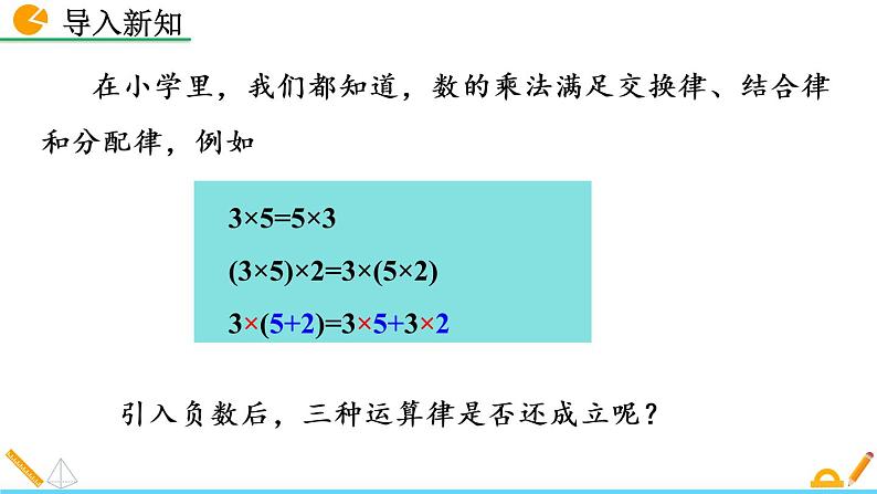 北师大版七年级上册2.7 有理数的乘法图片ppt课件: 这是一份北师大版七年级上册2.7 有理数的乘法图片ppt课件,共23页。PPT课件主要包含了学习目标,导入新课,复习回顾,新知探究,你有什么发现吗,你有什么发现,ab=ba,乘法交换律,乘法结合律,ab+c等内容,欢迎下载使用。