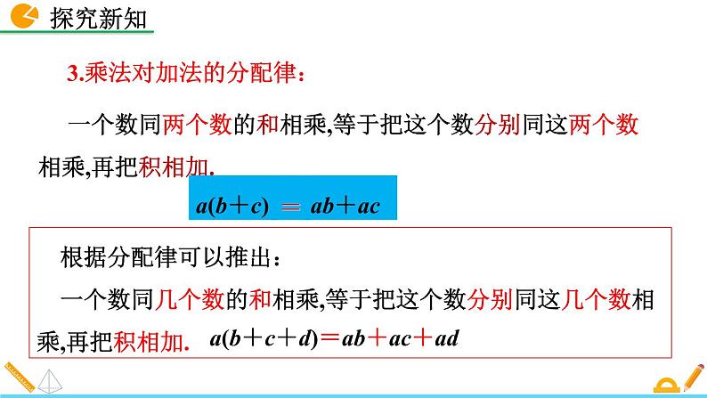 根据分配律可以推出: 一个数同几个数的和相乘,等于把这个数分别同这几个数相乘,再把积相加.