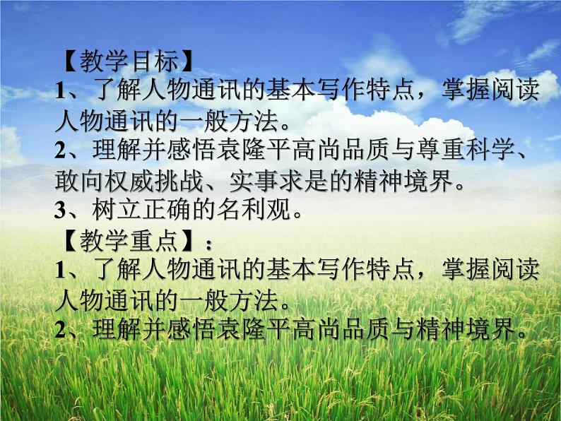 人教统编版必修 上册第二单元4 (喜看稻菽千重浪――记首届国家最高科技奖获得者袁隆平 *心有一团火,温暖众人心 *“探界者”钟扬)4.1 喜看稻菽千重浪――记首届国家最高科技奖获得者袁隆平精品课件pp: 这是一份人教统编版必修 上册第二单元4 (喜看稻菽千重浪――记首届国家最高科技奖获得者袁隆平 *心有一团火,温暖众人心 *“探界者”钟扬)4.1 喜看稻菽千重浪――记首届国家最高科技奖获得者袁隆平精品课件ppt,共27页。PPT课件主要包含了袁隆平的两个梦,禾下乘凉梦,水稻覆盖全球梦,袁隆平简介,新闻价值,社会效应,文化价值,◎通讯,◎关于人物通讯,任务一预习检查等内容,欢迎下载使用。