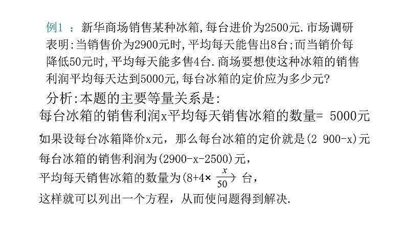 展开例1 :新华商场销售某种冰箱,每台进价为2500元.市场调研表明:当销售价为2900元时,平均每天能售出8台;而当销价每降低50元时,平均每天能多售4台.商场要想使这种冰箱的销售利润平均每天达到5000元,每台冰箱的定价应为多少元?