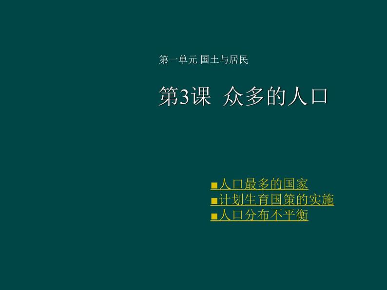 人口最多的国家: 13亿人口计划生育国策的实施:控制人口数量,提高人口素质。 鼓励晚婚、晚育、少生、优生人口分布不平衡:黑河至腾冲一线为界,以东人口比较稠密尤其东 部沿海平原地区,以西人口比较稀疏,尤其西部 内陆高山、荒漠地区。人口多带来的问题:制约着中国人民整体生活水平的迅 速提高;各种资源和工农业产品的人均占有 量远低于世界平均水平;教育、科学和文化事业也难以 更快地发展,影响了人口素质的提高;交通、住房、就 业、环境污染等问题。