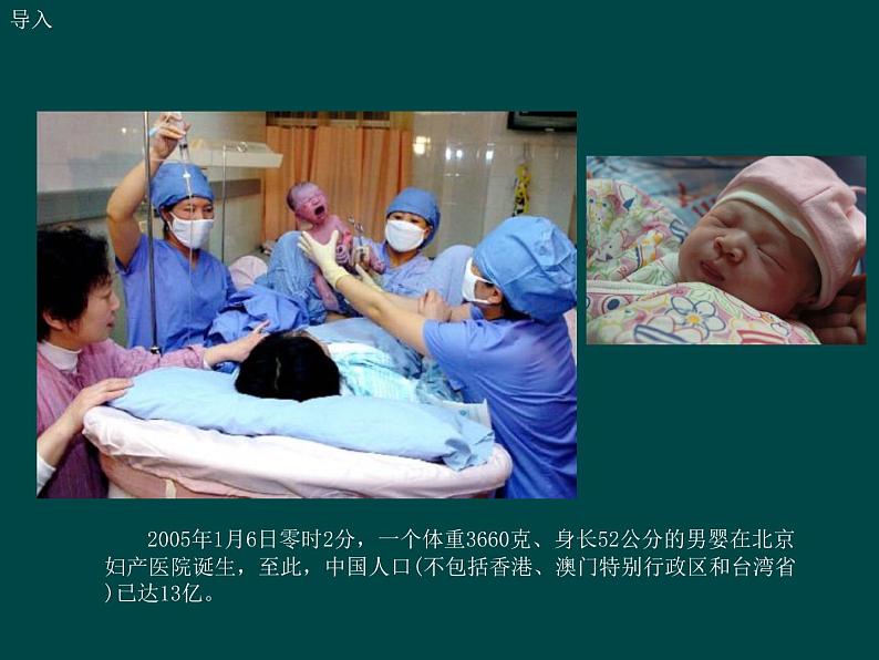 展开2005年1月6日零时2分,一个体重3660克、身长52公分的男婴在北京妇产医院诞生,至此,中国人口(不包括香港、澳门特别行政区和台湾省)已达13亿。