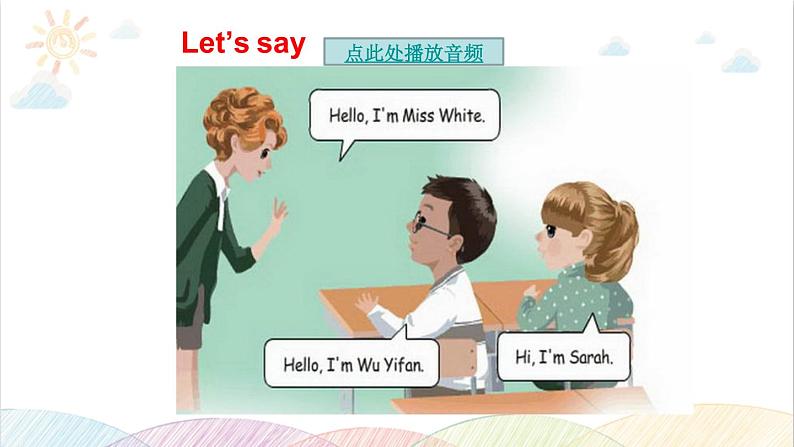 英语三年级上册Unit 1 Hello! Part A示范课课件ppt: 这是一份英语三年级上册<a href="/yy/tb_c64364_t3/?tag_id=26" target="_blank">Unit 1 Hello! Part A示范课课件ppt</a>,文件包含ALetstalkLetsplaypptx、1wav、2wav、3wav、ALetstalkmp3、HelloHellomp4、Unit1ALetstalkmp4、Unit1Mainscenemp4等8份课件配套教学资源,其中PPT共23页, 欢迎下载使用。