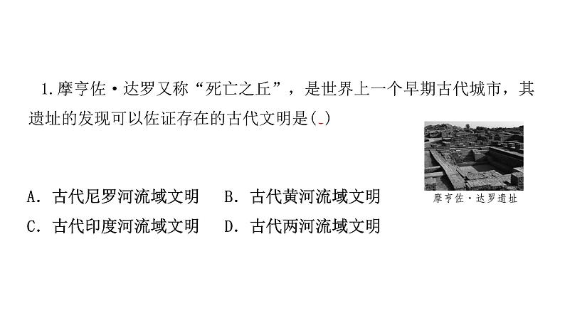 1.摩亨佐·达罗又称“死亡之丘”,是世界上一个早期古代城市,其遗址的发现可以佐证存在的古代文明是(C)