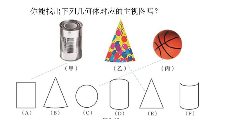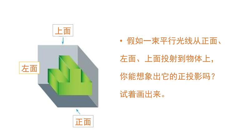假如一束平行光线从正面、左面、上面投射到物体上,你能想象出它的正投影吗?试着画出来。